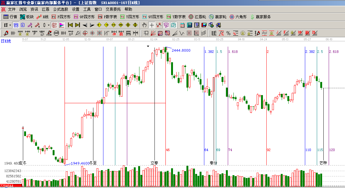 ☆依據(jù)贏家江恩系統(tǒng)黃金時(shí)間周期線(xiàn)提示:從1949點(diǎn)至2444點(diǎn)做時(shí)間圖(3),6月7號(hào)為時(shí)間窗,明天24節(jié)氣芒種市場(chǎng)風(fēng)格有望轉(zhuǎn)化為緩跌啟穩(wěn);