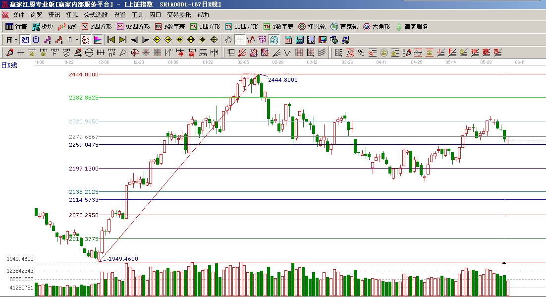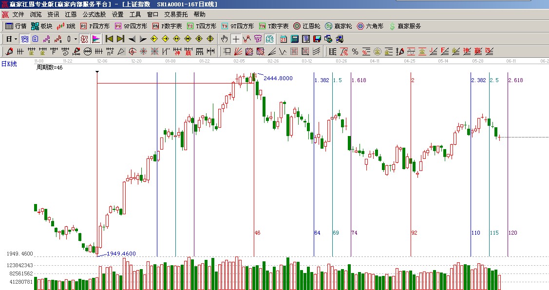 ☆依據(jù)贏家江恩系統(tǒng)黃金時(shí)間周期線提示:從1949點(diǎn)至2444點(diǎn)做時(shí)間圖(3),6月7號為時(shí)間窗,明天24節(jié)氣芒種市場風(fēng)格有望轉(zhuǎn)化為緩跌啟穩(wěn);
