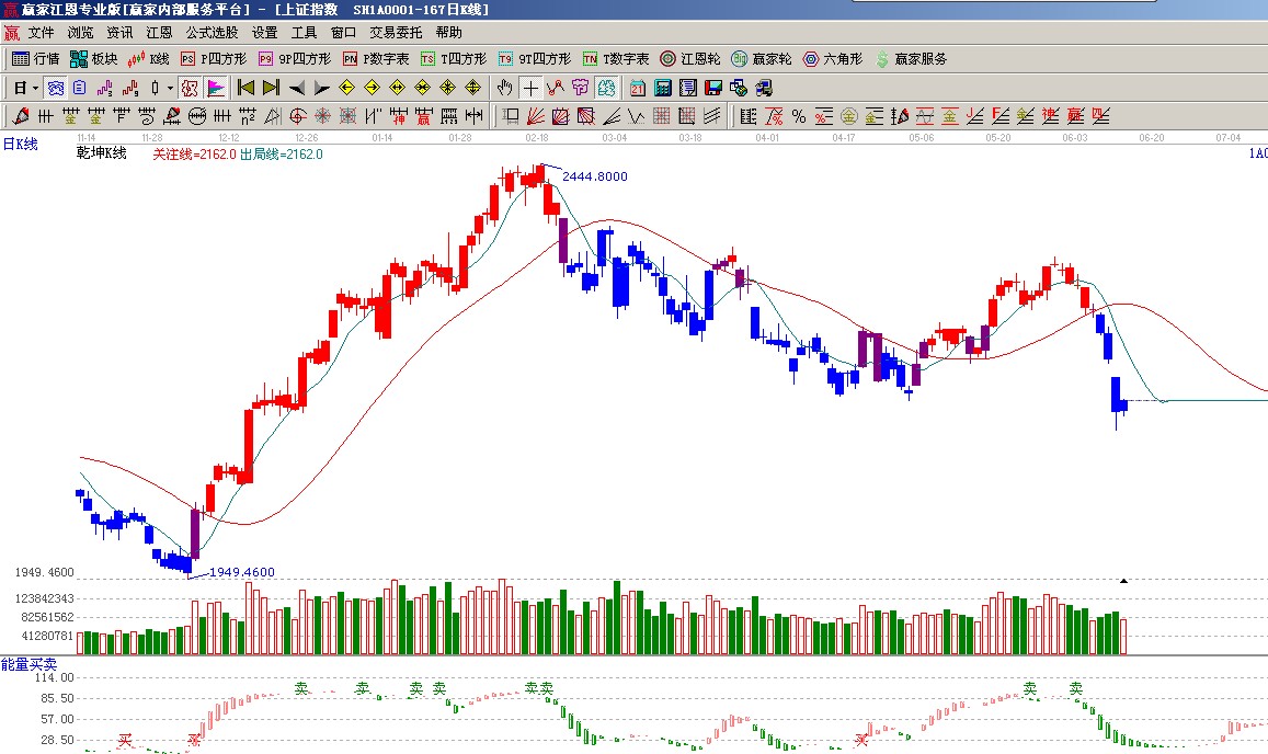 ☆依據(jù)贏家江恩系統(tǒng)乾坤K線提示:藍色K線代表弱勢休息,投資者應(yīng)順應(yīng)市場如圖(1);