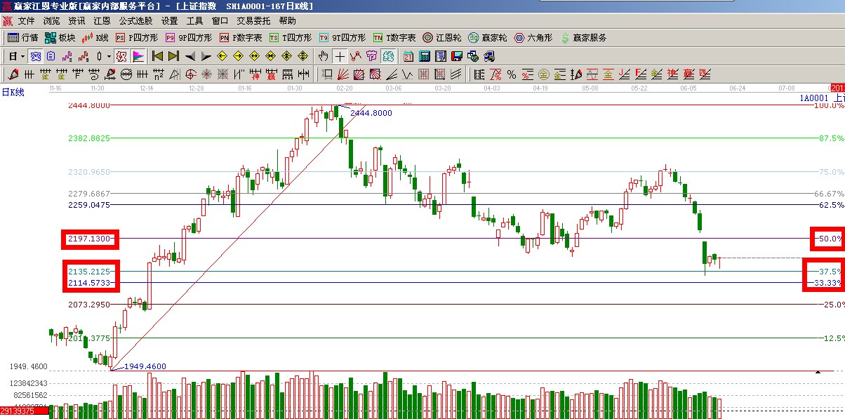 ★依據(jù)贏家江恩系統(tǒng)波段百分比提示:120度與135度(2114-2135)構(gòu)成指數(shù)當(dāng)前支撐帶,180度(2197)與缺口枃成阻力帶,市場有望在江恩波段百分比震蕩帶出現(xiàn)止跌,如圖(2);