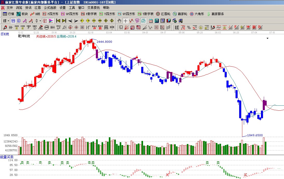 ☆依據(jù)贏家江恩系統(tǒng)乾坤K線提示: 紫色為警示信號(hào),變紅則看多,近期還需關(guān)注金叉是否能形成;(1)