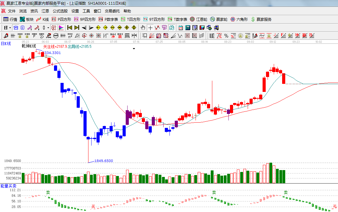 ★依據(jù)贏家江恩系統(tǒng)乾坤K線提示:出局線如期跌破,關(guān)注線將慢慢上移展開反抽;(1)