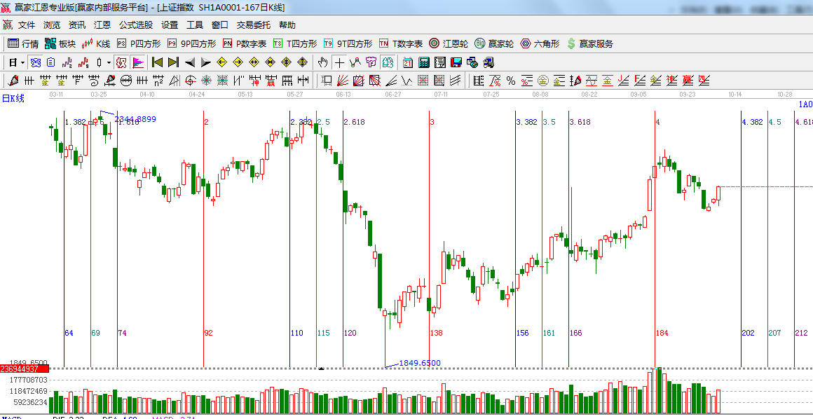 ☆依據(jù)贏家江恩系統(tǒng)乾坤K線提示: K線顏色仍為紫色,等待市場(chǎng)方向的選擇;