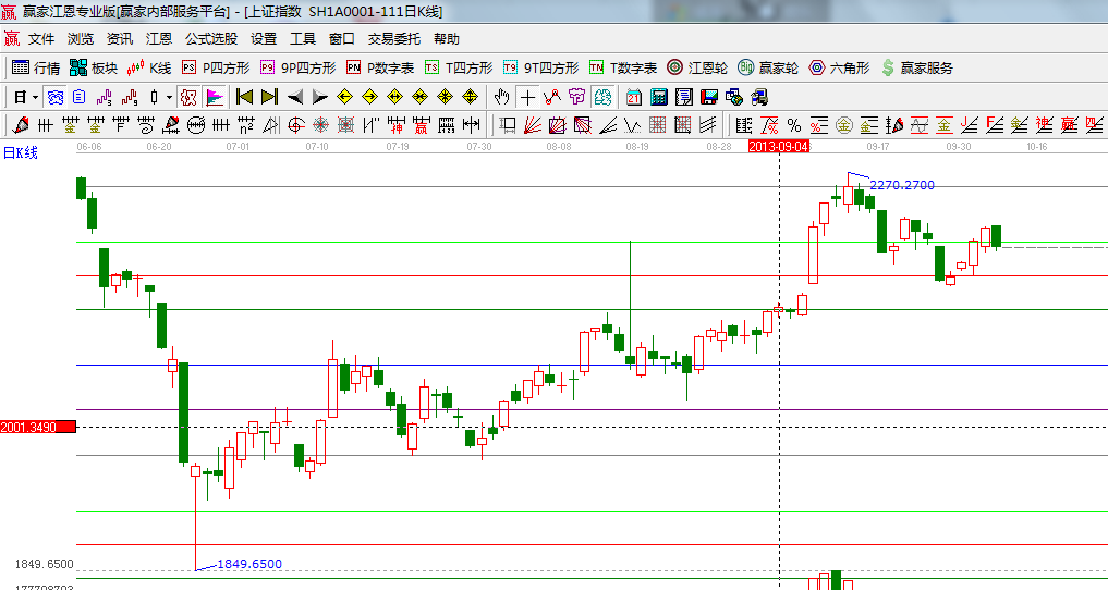 ☆依據(jù)贏家江恩系統(tǒng)波段百分比延伸提示:0度位置是2160點,上方位置是315度2200點;