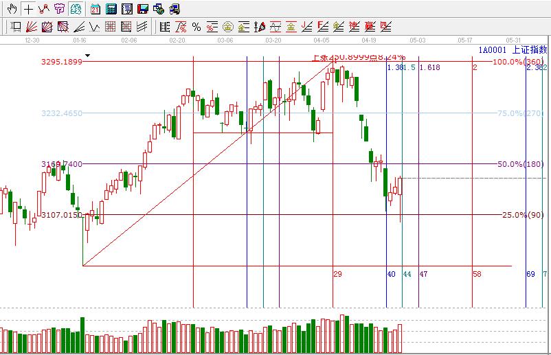 依據(jù)贏家江恩技術(shù)工具分析得出:周四,股指在藍(lán)色線超跌區(qū)域探底回升,成交量有所釋放,短期還有反彈空間,接下來關(guān)注180度線3170點(diǎn)附近,缺口3189--3196點(diǎn)。有技術(shù)基礎(chǔ)的投資者,可以把握短線反彈機(jī)會(huì),整體由于趨勢(shì)生命線之下,弱勢(shì)區(qū)域。倉(cāng)位控制在3-5成。手中個(gè)股可適當(dāng)逢低補(bǔ)倉(cāng)差價(jià)。時(shí)間上,25日之后下一窗口5月2日左右。