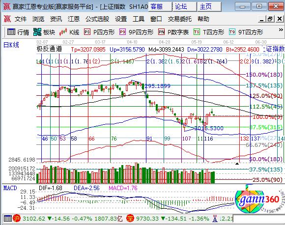 大盤周四低開震蕩下跌0.47%,深成指和創(chuàng)業(yè)板跌幅較大分別下跌1%和2%,市場再現(xiàn)百股跌停模式。板塊方面,保險、銀行、釀酒、家電和石油逆勢上漲,權(quán)重僅券商小跌;題材方面,次新、可燃冰、國產(chǎn)軟件、高送轉(zhuǎn)領(lǐng)跌,個股普跌成交量較前日略微放量。技術(shù)方面,滬指江恩百分比零度3097位置再度獲得支撐,收盤勉強(qiáng)站上3100點,預(yù)計市場走勢如5月26號所言,圍繞在零度與極反通道構(gòu)成的空間運(yùn)行,昨日盤中已提醒短周期15將要失守,今天30、60分鐘生命線會形成盤中支撐,操作上控制倉位在5成以下,針對波段股進(jìn)行差價操作,待市場有賺錢效應(yīng)后再開新倉,3089、3078為日內(nèi)支撐,3118、3128為日內(nèi)阻力,僅供參考,不構(gòu)成任何投資建議。