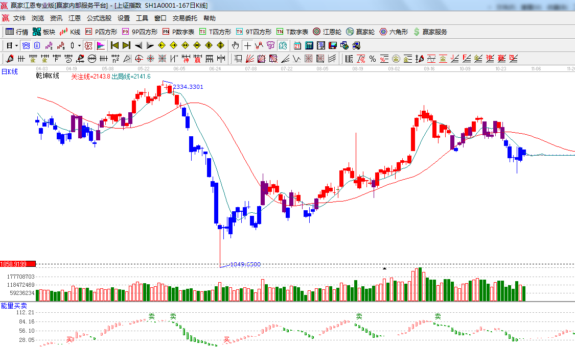 ☆依據(jù)贏家江恩系統(tǒng)能量買賣提示:空頭綠色柱子縮短,有翻紅的跡象,等待確認;