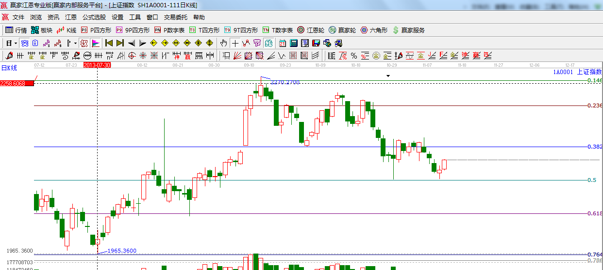 ★依據(jù)贏家江恩系統(tǒng)波段百分比延伸提示:黃金分割價(jià)格圖0.5位置是2090,0.382位置是2049;