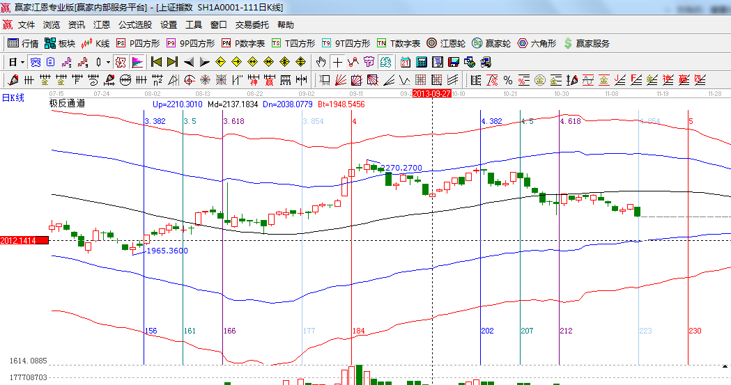 ★依據(jù)贏家江恩系統(tǒng)波段百分比延伸提示:黃金分割價(jià)格圖0.5位置是2090,0.382位置是2049;