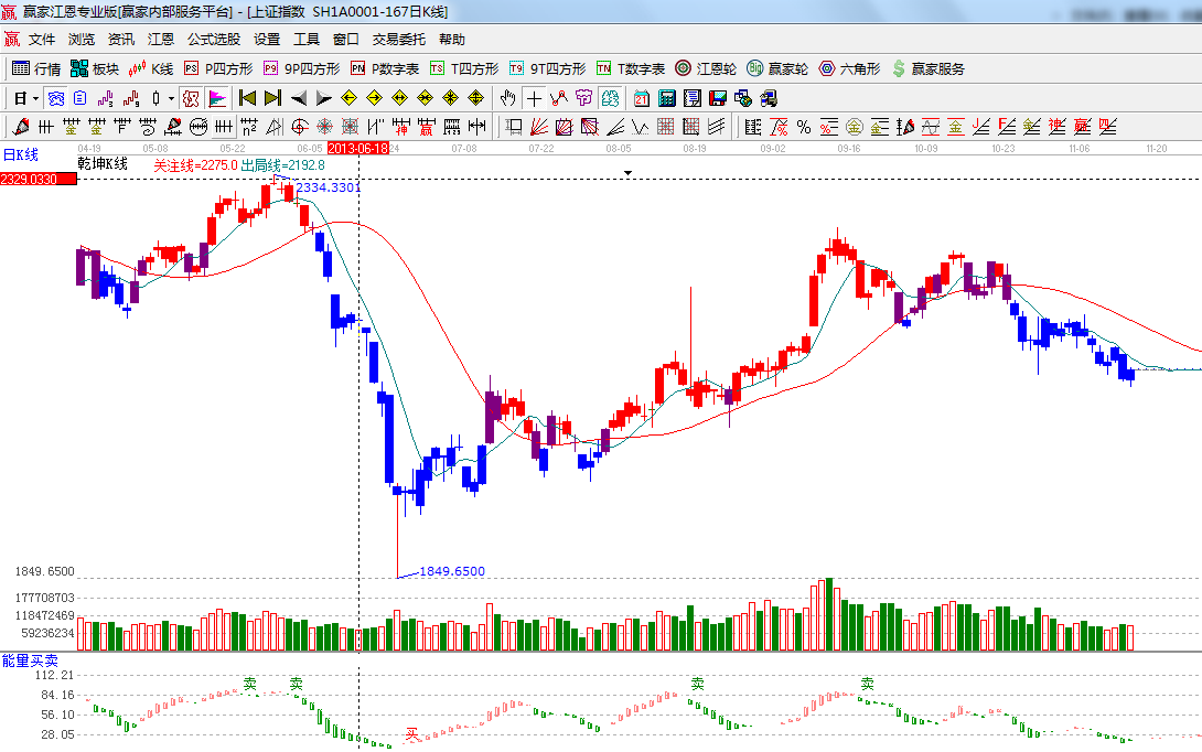 ☆依據(jù)贏家江恩系統(tǒng)能量買賣提示:綠色柱子空方占優(yōu)看空;