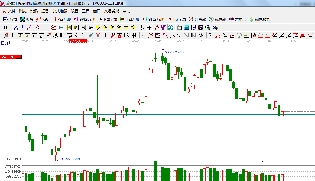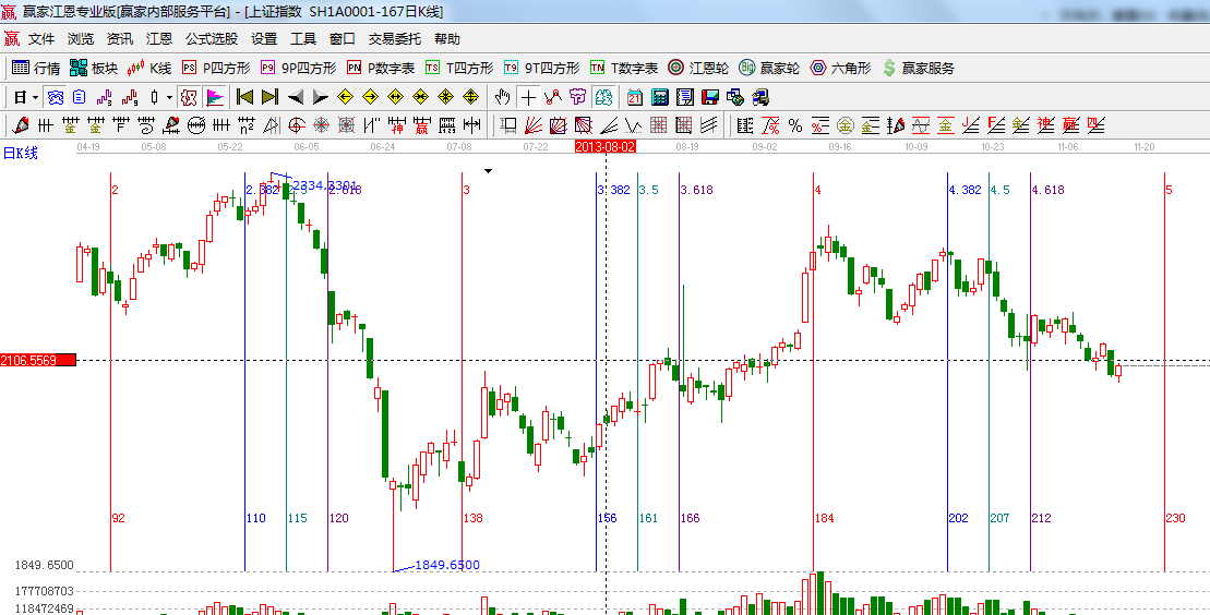 ★依據(jù)贏家江恩系統(tǒng)波段百分比延伸提示:黃金分割價(jià)格圖0.382位置是2149點(diǎn),0.5位置是2090;