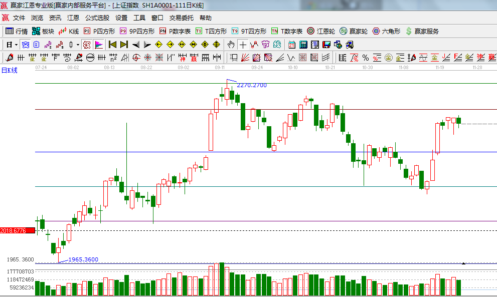 咨詢:13333833889本周初18號滬指放量中陽突破江恩軟件極反通道生命線2170位置,隨后轉(zhuǎn)入橫盤震蕩格局,市場賺錢效應(yīng)與活躍度增加成交量顯著放大,市場熱點圍繞改革題材炒作,如二胎開放、軍工、天津自貿(mào)區(qū),特別是進入年底行情高送轉(zhuǎn)概念股也將成為持續(xù)的熱點,滬指趨勢不破極反通道生命線處于安全操作區(qū)投資者可繼續(xù)這類短期調(diào)整后的機會;技術(shù)方面從K線組合判斷中陽橫盤后遇到費氏時間將出現(xiàn)方向選擇,通常時間窗為陽線后的第3天、5天、8天,重點觀察市場下周初變化,波段思路看好未來行情,倉位上可保持在5成或5成以上,短線、波段結(jié)合操作;
