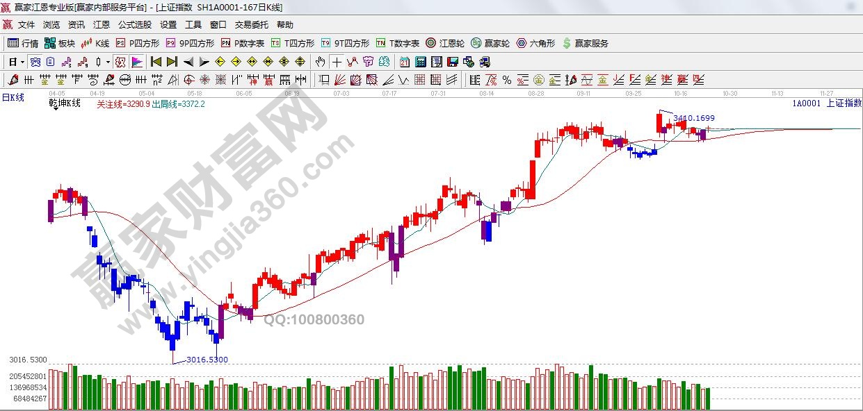 ★依據(jù)贏家江恩理論系統(tǒng)乾坤K線提示:紫紅色關(guān)注線之上,依據(jù)規(guī)則,關(guān)注線之上波段看多,綠色之下,短線謹(jǐn)慎。