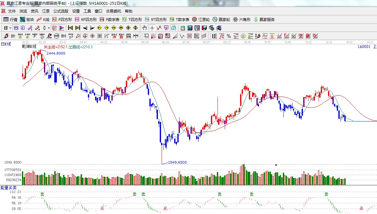 ☆依據(jù)贏家江恩系統(tǒng)乾坤K線提示:反抽到出局線位置壓制,藍色K線繼續(xù)看空;