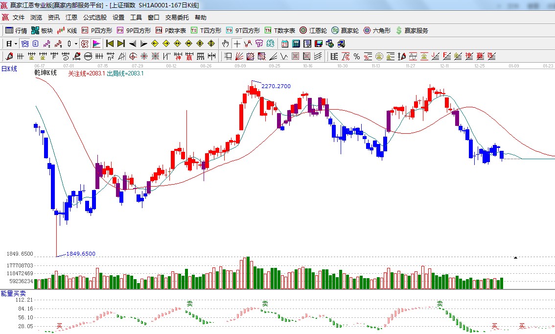 ☆依據(jù)贏家江恩系統(tǒng)乾坤K線提示:藍(lán)色K線表示空頭,同時(shí)收盤價(jià)在短期出局線下,繼續(xù)休息為主;