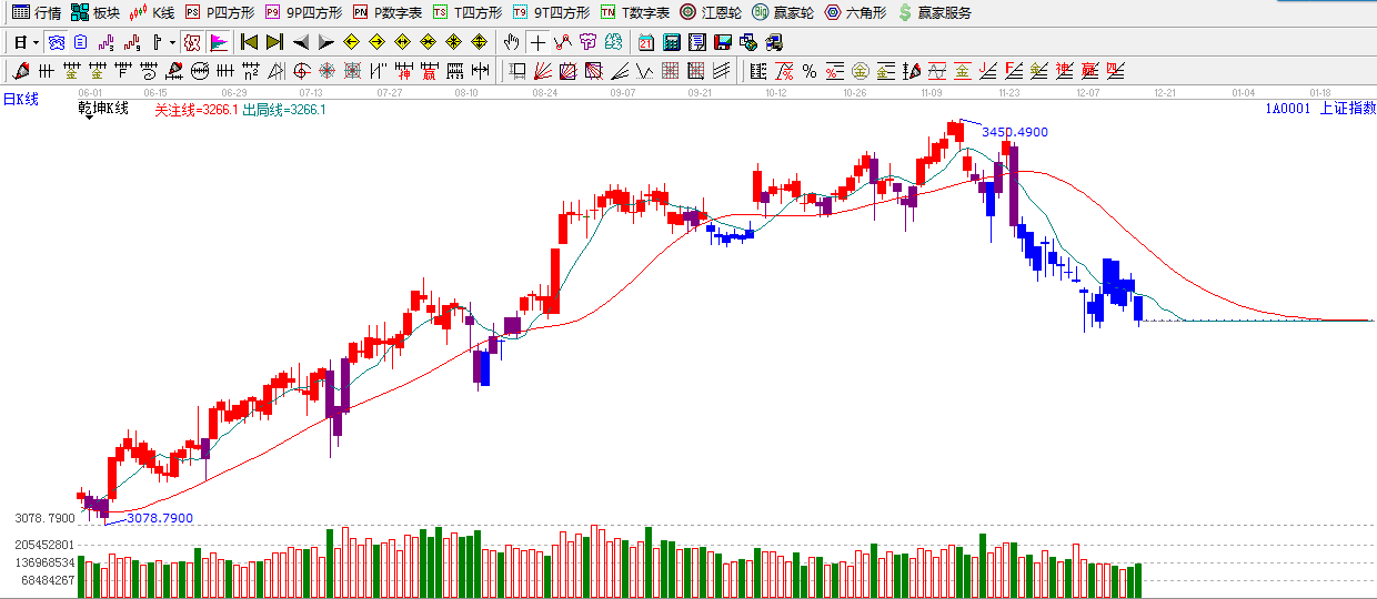 ☆依據(jù)贏家江恩理論系統(tǒng)乾坤K線提示:紅色關(guān)注線之下,k線處于藍(lán)色休息區(qū),依據(jù)規(guī)則,趨勢弱勢,空頭區(qū)域。