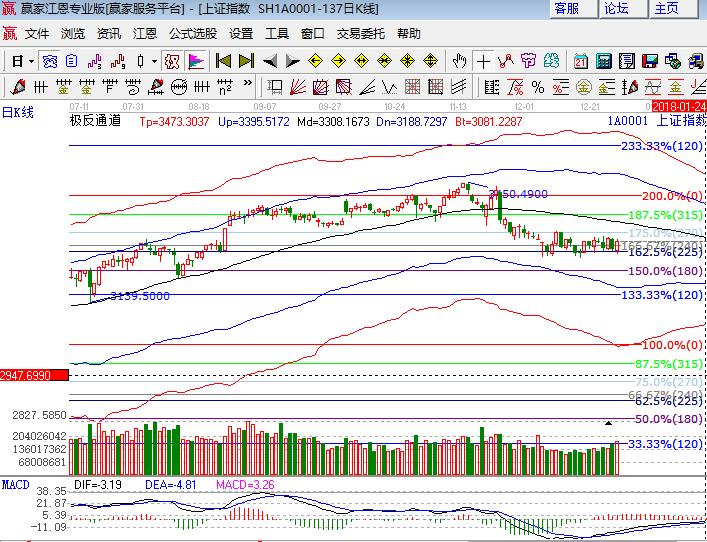 滬指周四低開高走上漲0.63%,主要是大藍籌拉抬,深市走勢較弱,創(chuàng)業(yè)板微跌。板塊方面,釀酒、有色、鋼鐵、煤炭、家電等板塊領(lǐng)漲,大金融、石油跑贏大盤;題材方面,部分次新、新能源、高送轉(zhuǎn)概念盤中表現(xiàn),天然氣、維生素、大數(shù)據(jù)、芯片領(lǐng)跌,個股上漲居多成交量持續(xù)放大。技術(shù)方面,大盤日線圍繞江恩百分比225度3272點震蕩后拉起,收盤站在240度3288點上方,本月基本維護在225度與270度構(gòu)造的空間上下震蕩,周線的時間窗銜接17年末與18年初,23號用戶群課談到本周是相對安全的,對于1月份的操作是相對謹(jǐn)慎的,回顧11月21號的點評,對于以年為單位的持股是可以忽略這里的中期調(diào)整,而對于趨勢交易者已在11月出局,按時間周期計算18年1、2月份是趨勢交易者分倉建中長線標(biāo)的時機,對于短期漲、橫、跌三類區(qū)間已重復(fù)多次,我們應(yīng)對不同的策略來應(yīng)對即可,上證50繼續(xù)觀察日生命線得失。操作策略上波段4成倉持股不動,3288、3272為日內(nèi)支撐,3308、3321為日內(nèi)壓力。僅供參考,不構(gòu)成任何投資建議。