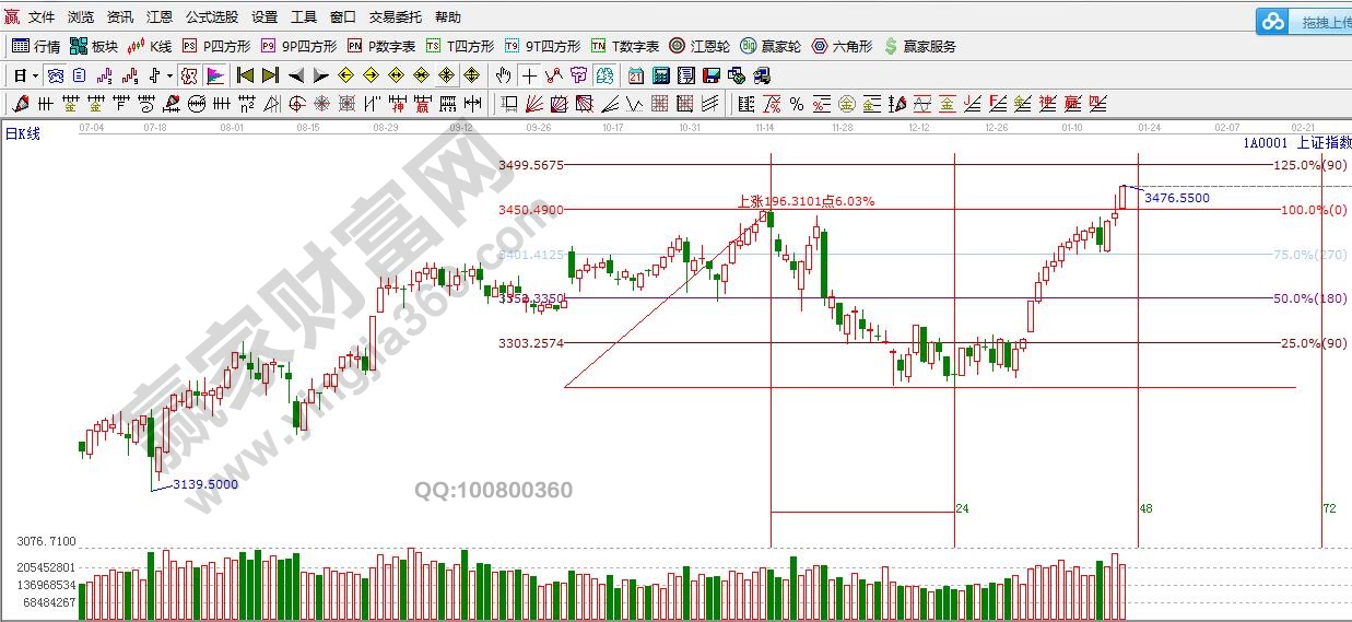 ★依據(jù)贏家江恩理論系統(tǒng)江恩波段百分比提示:滬指在創(chuàng)新高,3450點轉變?yōu)橹?,百分比目標位?0度3499點附近。