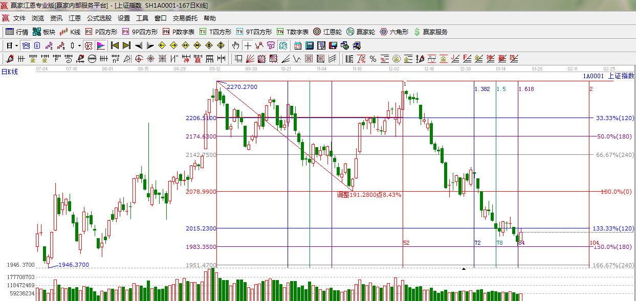 ★依據(jù)贏家江恩系統(tǒng)波段百分比提示:今日指數(shù)如期拉出小陽(yáng)線,盤(pán)中最高點(diǎn)正好打到昨天提到的2015點(diǎn)(120度),反彈量能依然不足。