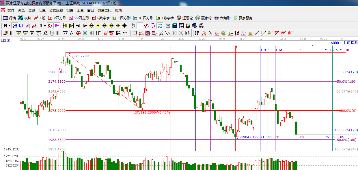 綜上所述:依據(jù)贏家江恩技術(shù)工具分析得出:早盤(pán)滬深兩市大幅低開(kāi),一路震蕩走低,明日下方關(guān)注180度1984點(diǎn),240度1951點(diǎn),短期市場(chǎng)弱勢(shì)震蕩整理為主,暫時(shí)不會(huì)出現(xiàn)大幅反彈,多看少動(dòng),等待市場(chǎng)跌出機(jī)會(huì),星級(jí)風(fēng)險(xiǎn)提示,看空。