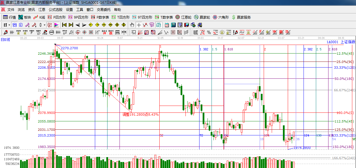 ★依據(jù)贏家江恩系統(tǒng)波段百分比提示:明日關(guān)注阻力位90度2031點,缺口位置2051點,下方支撐180度位置1984點附近,240度位置1951點附近。