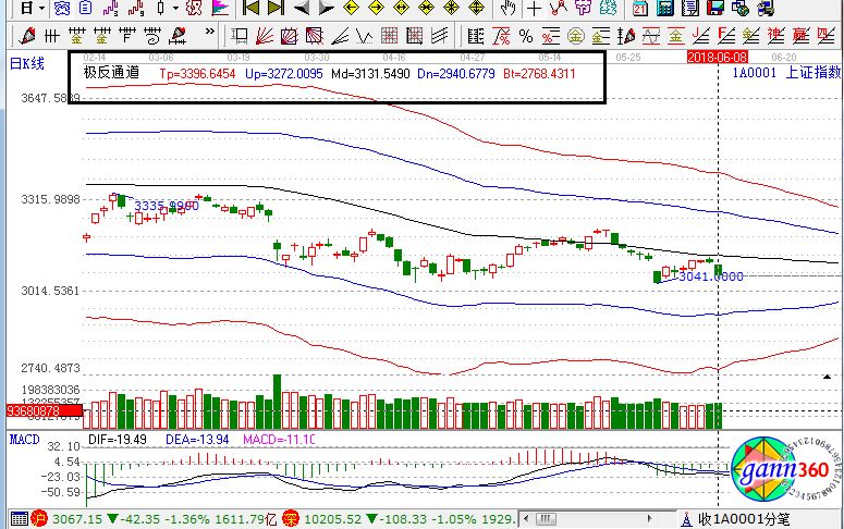 滬指跌1.36%,報收3067點;深成指跌1.05%,報收10205點;創(chuàng)業(yè)板跌1.09%,報收1711點。從盤面上看,小米概念、富士康概念、無人零售、5G、細胞免疫治療、半導體等少數(shù)板塊上漲,分散染料、證券、煤炭、有色、草甘膦、自由貿(mào)易港等板塊下跌。全天,滬股通凈流出6.8億元,深股通凈流入16億元。相應的極反通道指標的支撐壓力提示,如下圖所示: