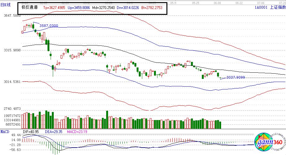 滬指跌0.47%,報收3052點;深成指跌0.30%,報收10175點;創(chuàng)業(yè)板跌1.34%,報收1688點。從盤面上看,互聯(lián)網(wǎng)彩票、鋼鐵、有色、無線充電、小米概念、水泥等板塊上漲,啤酒、醫(yī)療器械、食品加工、分散染料、頁巖氣、生物制藥等板塊下跌。全天,滬股通凈流入29億元,深股通凈流入14億元。相應(yīng)的極反通道指標的支撐壓力提示,如下圖所示: