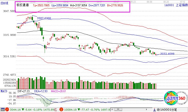 滬指跌0.18%,報(bào)收3044點(diǎn);深成指跌0.76%,報(bào)收10084點(diǎn);創(chuàng)業(yè)板跌0.75%,報(bào)收1673點(diǎn)。盤(pán)面上看,鋼鐵、稀土永磁、水泥、煤炭、證券、集成電路等板塊上漲;足球概念、白酒、新疆振興、互聯(lián)網(wǎng)彩票、家用電器等板塊下跌。全天,滬股通凈流入19億元,深股通凈流入10億元。相應(yīng)的極反通道指標(biāo)的支撐壓力提示,如下圖所示:
