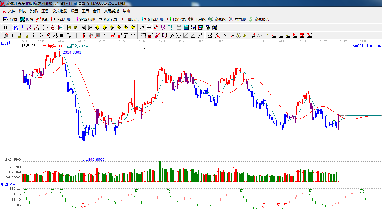 ☆依據(jù)贏家江恩系統(tǒng)乾坤K線提示:底部由藍色變?yōu)樽仙?,警示信號,關(guān)注線下方,謹慎看多。