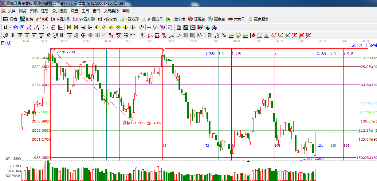 ☆依據(jù)贏家江恩系統(tǒng)黃金時間周期線提示:下周一24號是近期提到的日線窗口,留意盤面變化。