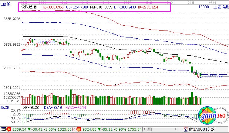滬指跌1.05%,報收2859點;深成指跌0.90%,報收9324點;創(chuàng)業(yè)板跌0.72%,報收1538點。從盤面上看,石油采掘、白酒、債轉(zhuǎn)股、鈦白粉、農(nóng)業(yè)、次新股、上海國資改革等板塊漲幅居前;機場航運、鋼鐵、煤炭、銀行、租售同權(quán)、豬肉、造紙等板塊跌幅居前。滬股通凈流出23億,深股通凈流出12億。相應(yīng)的極反通道指標(biāo)的支撐壓力提示,如下圖所示: