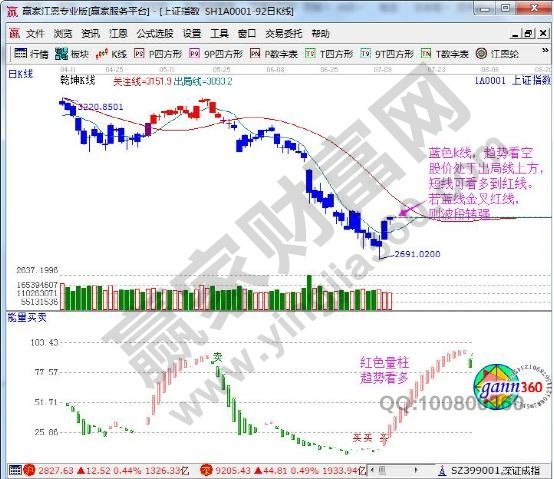 ☆依據(jù)贏家江恩理論系統(tǒng)乾坤K線提示:藍(lán)色K線,波段趨勢仍為空;股價處于出局線上方,短線看多到紅線。波段仍需等待藍(lán)線金叉紅線,才是轉(zhuǎn)強(qiáng)信號。