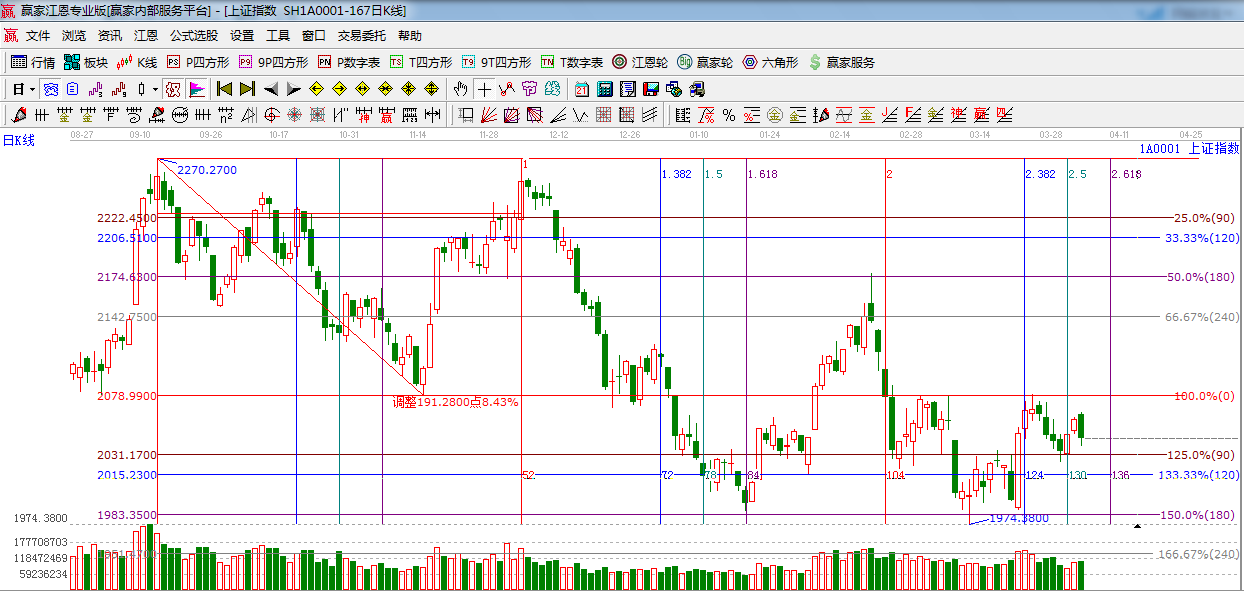 綜上所述:依據(jù)贏家江恩技術(shù)工具分析得出:周四略帶成交量的中陰線破位生命線,短期將再次考驗(yàn)江恩90度2031點(diǎn)位置,此位置如失守,空方將占據(jù)絕對(duì)優(yōu)勢(shì),明日關(guān)注生命線的爭(zhēng)奪,操作上,保持謹(jǐn)慎態(tài)度。星級(jí)風(fēng)險(xiǎn)提示,看空。