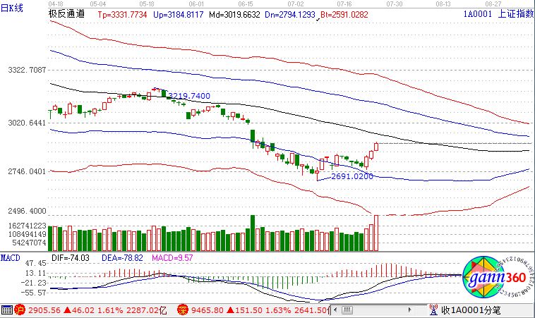 滬指1.61%,報收2905點;深成指漲1.63%,報收9465點;創(chuàng)業(yè)板漲0.53%,報收1629點。從板塊漲幅上看,水泥、白酒、中字頭股票、建筑、PPP概念、港口航運等板塊上漲。滬股通凈流入17億,深股通凈流入10億。相應(yīng)的極反通道指標(biāo)的支撐壓力提示,如下圖所示: