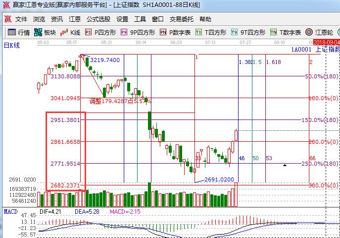 ★依據(jù)贏家江恩理論系統(tǒng)波段百分比延伸線提示:以5月21號高點為起點,5月30號低點為終點做百分比延伸線如下圖,180度、零度對應(yīng)的是2771點、2861點,2861零度位置不破,短線還有望向上2951靠近。