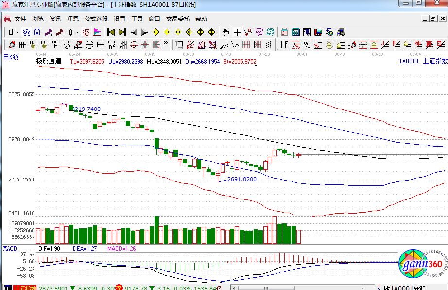 滬指漲0.26%,報2876點;深成指跌0.03%,報9178點;創(chuàng)業(yè)板指漲0.10%,報1561點。盤面上看,國企改革、石油采掘、二胎概念、租售同權(quán)等板塊漲幅居前;深圳國資改革、鋼鐵、軍工、水泥、化工新材料、煤炭等板塊跌幅居前。滬股通凈流入19億,深股通凈流入13億。相應的極反通道指標的支撐壓力提示,如下圖所示: