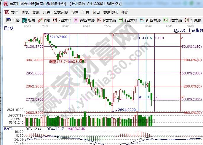 江恩看盤綜述:通過江恩理論系統(tǒng)趨勢、時(shí)間、價(jià)格工具綜合評判市場一星看多(五星評級(jí)標(biāo)準(zhǔn))。大盤日線受生命線反壓下跌向藍(lán)色下軌線尋找支撐,短周期15、30、60分鐘時(shí)價(jià)共振是下跌途中的暫緩信號(hào);空間上,江恩百分比延伸線顯示,連續(xù)兩日市場擊破零度、180度對應(yīng)的2862點(diǎn)、2772點(diǎn),2772點(diǎn)反復(fù)不能收復(fù)則直逼新低; 時(shí)間上,日線時(shí)間點(diǎn)是明天及下周一,周線時(shí)間窗是8月16,大盤月線極反通道藍(lán)色下軌線是2680附近,等待時(shí)間窗口是否與價(jià)格形成共振,在此期間多看少動(dòng),弱勢行情下本金安全是第一位。