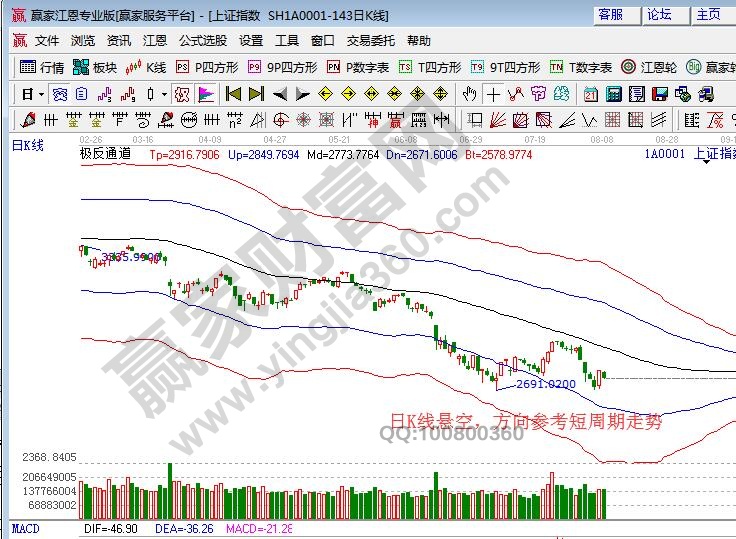 ☆依據(jù)贏(yíng)家江恩理論系統(tǒng)極反通道提示:滬指短周期15分鐘未能延續(xù)上攻藍(lán)色上軌線(xiàn),拐頭向下回踩確認(rèn)黑色生命線(xiàn),收盤(pán)正好落在此線(xiàn)上,明天早盤(pán)觀(guān)察此線(xiàn)得失,收復(fù)站穩(wěn)則向上看至藍(lán)色上軌線(xiàn)2790附近,反之按規(guī)則失守一線(xiàn)看低一線(xiàn),弱勢(shì)藍(lán)色下軌線(xiàn)是2690位置,日線(xiàn)弱勢(shì)通道波段看空。