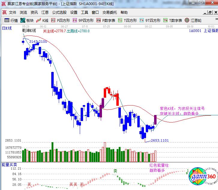 ★依據(jù)贏家江恩理論系統(tǒng)乾坤K線提示:K線顏色由藍變紫,為波段關注信號;股價突破關注線,短線、波段看多。