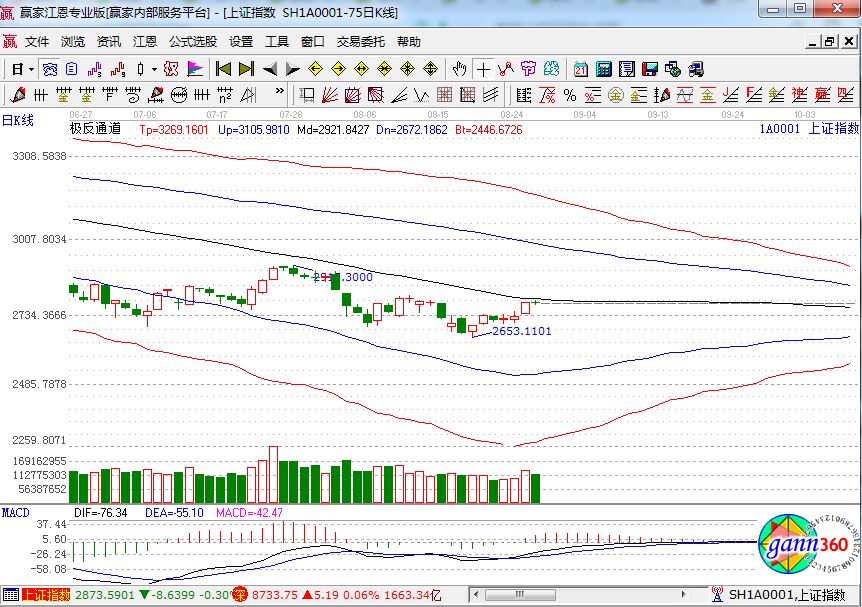 滬指下跌0.11%,報收2777點;深成指上漲0.06%,報收8733點;創(chuàng)業(yè)板下跌0.02%,報收1493點。從盤面上看,分散染料、在線旅游、量子通信等板塊漲幅居前;杭州亞運會、公交、可燃冰等板塊跌幅居前。滬股通凈流入6.34億,深股通凈流入9.84億。相應(yīng)的極反通道指標(biāo)的支撐壓力提示,如下圖所示: