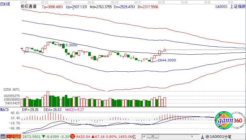 滬指漲0.92%,報收2806點;深成指漲0.80%,報收8420點;創(chuàng)業(yè)板漲1.06%,報收1420點。從盤面上看,物流、白酒、食品飲料、醫(yī)藥商業(yè)、油改、醫(yī)療器械等板塊上漲;種植業(yè)、氟化工、足球概念、互聯(lián)網(wǎng)彩票、鈦白粉、知識產(chǎn)權(quán)保護、軍工等板塊跌幅居前。滬股通凈流入15億,深股通凈流入6億。相應(yīng)的極反通道指標的支撐壓力提示,如下圖所示: