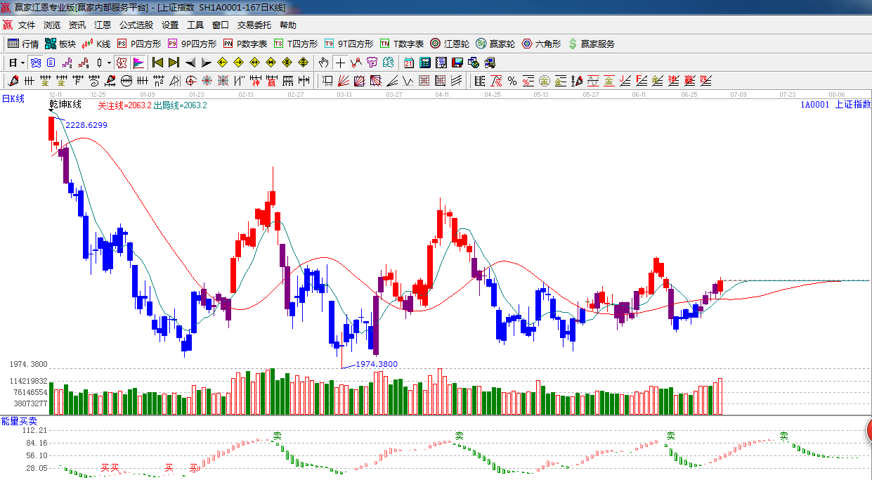 ★依據(jù)贏家江恩系統(tǒng)乾坤K線提示:k線處于關注線之上,k線由紫色轉變?yōu)榧t色,以為指數(shù)進入多頭可操作區(qū)域,看多。