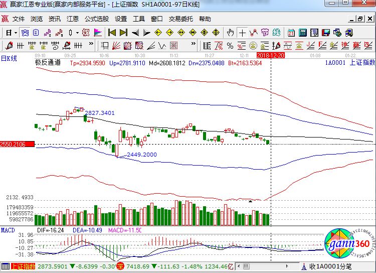 滬指跌1.05%,報收2549點;深成指跌1.48%,報收7418點;創(chuàng)業(yè)板跌1.90%,報收1268點。盤面上看,豬肉、石油、醫(yī)療器械、自由貿(mào)易港、醫(yī)藥電商等板塊跌幅居前。滬股通凈流出6900萬,深股通凈流出4億。相應的極反通道指標的支撐壓力提示,如下圖所示: