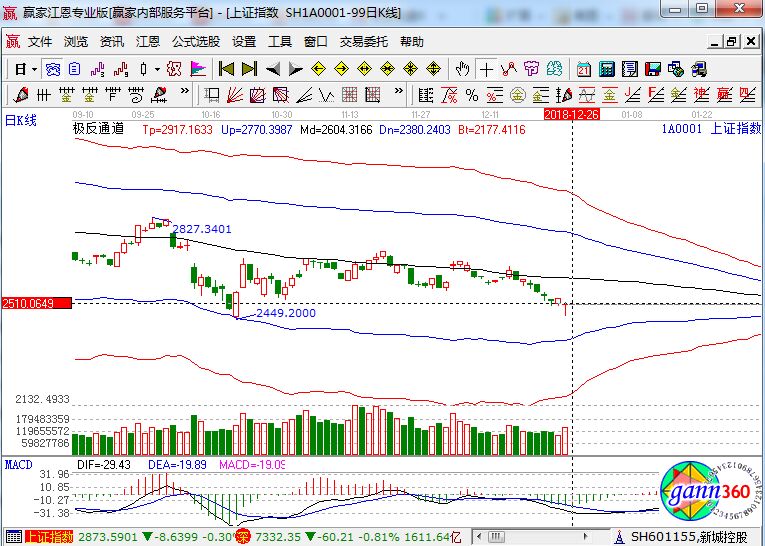 滬指跌0.88%,報(bào)收2504點(diǎn);深成指跌0.81%,報(bào)收7332點(diǎn);創(chuàng)業(yè)板跌0.85%,報(bào)收1273點(diǎn)。盤面上看,5G、量子通信、半導(dǎo)體等板塊漲幅居前;證券、鋼鐵、石油、手游等板塊跌幅居前。相應(yīng)的極反通道指標(biāo)的支撐壓力提示,如下圖所示: