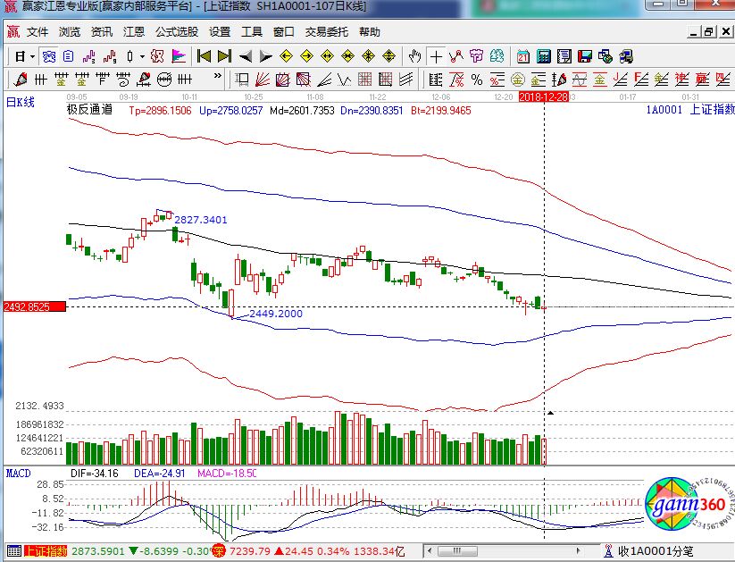 滬指上漲0.44%,報收2493.9點;深成指上漲0.34%,報收7239.79點;創(chuàng)業(yè)板指收漲0.2%,報收1250.53點。從盤面上看,海南、券商、北斗導(dǎo)航等板塊漲幅居前,次新股、油氣、特高壓等板塊跌幅居前。2018年,滬指從3307點到2493點,累計跌幅近25%;創(chuàng)業(yè)板指從1752點到1250點,累計跌幅近29%。相應(yīng)的極反通道指標的支撐壓力提示,如下圖所示: