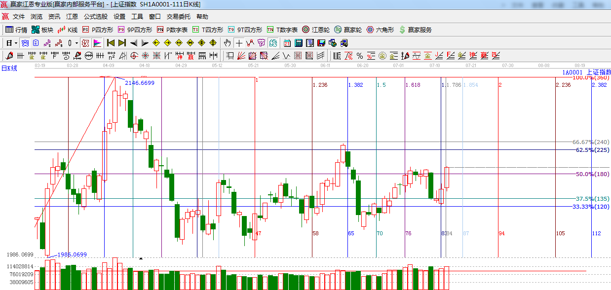 江恩看盤(pán)綜述:依據(jù)贏家江恩技術(shù)工具分析得出:今日指數(shù)震蕩走高,突破江恩180度2060點(diǎn),轉(zhuǎn)換為支撐,此位置不破有望去攻擊225度2082點(diǎn)附近,本周時(shí)間窗口留意17號(hào)附近。操作上,合理控制倉(cāng)位,短線,波段結(jié)合。