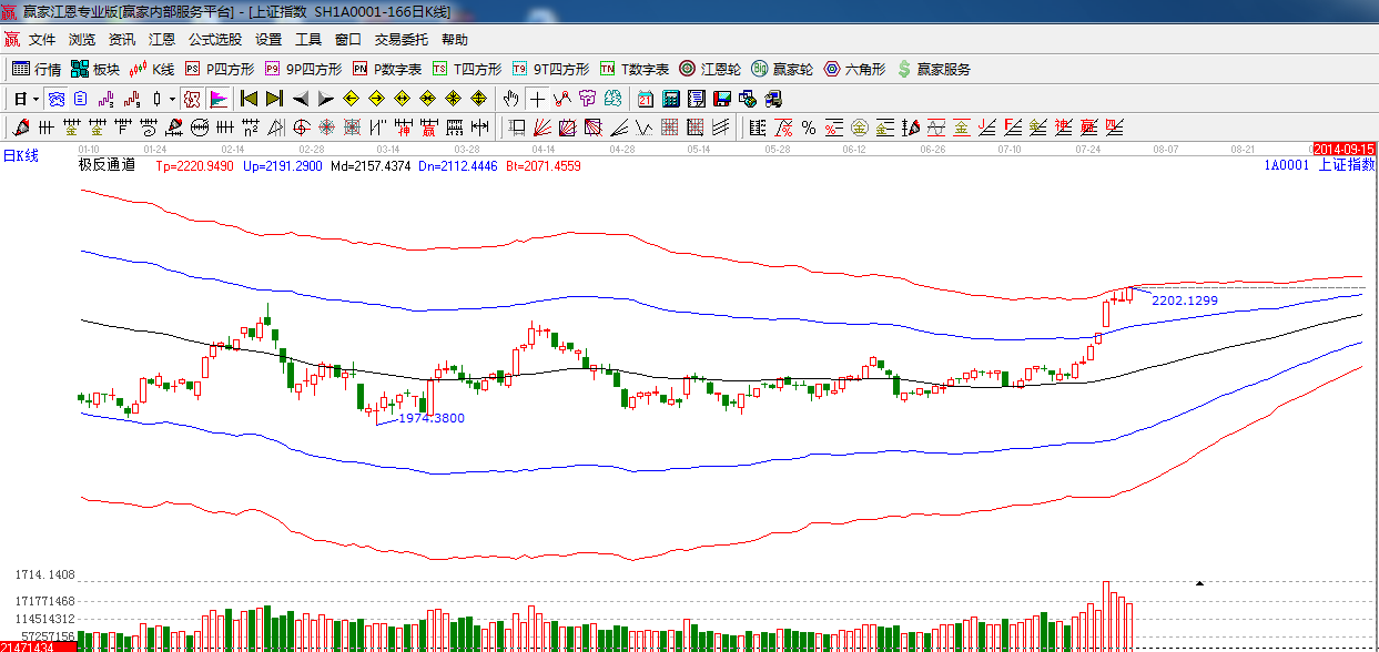極反通道提示:指數(shù)突破2200再創(chuàng)年內(nèi)新高,逼近紅色外軌阻力線,預計明日大盤將沖高回落。