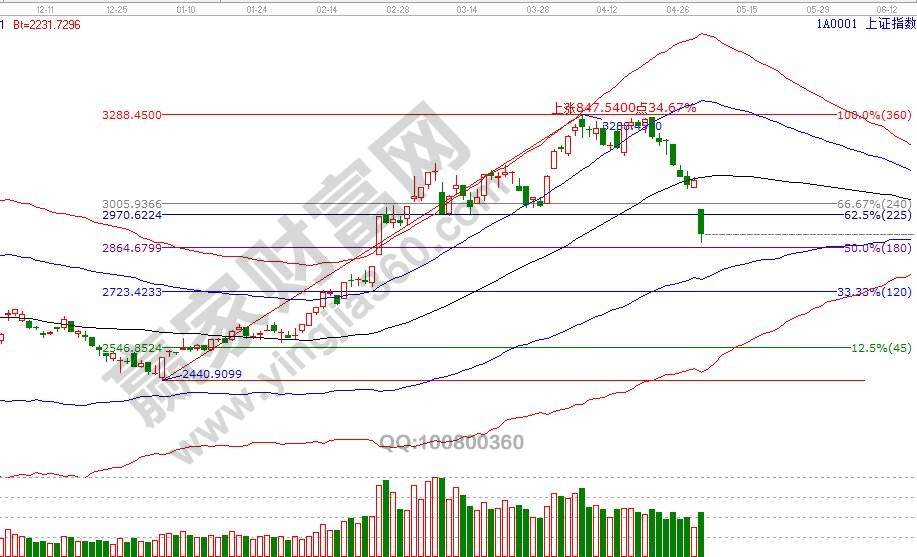 指數(shù)急跌之后即將觸及至周線極反通道生命線2836附近,同時江恩輪中輪60度2847點、波段百分比延伸線1倍循環(huán)二分位2834點支撐接近,按工具提示此區(qū)域是日線級別的一次短線交易機(jī)會,時間周期方面,早在4月24號已分享出5月時間窗口,8號是第一個日線時間窗口,規(guī)避了第一波主回調(diào)期后,空倉的學(xué)員等待時間窗口處的工具信號。操作策略,指數(shù)擊破黑色生命線,藍(lán)色下軌線是回撤目標(biāo)位,藍(lán)色下軌線性與2840附近是中線關(guān)注區(qū),做好計劃跟隨市場,整體倉位控制在3成以內(nèi)。