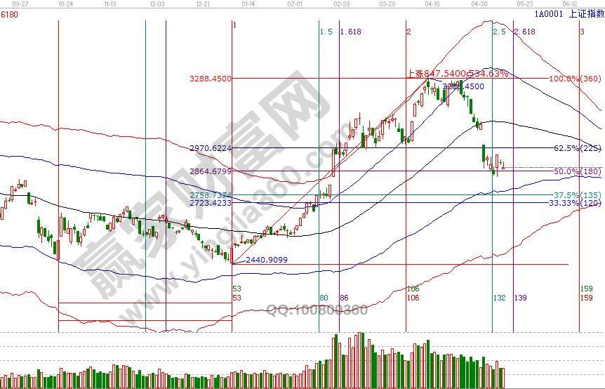 大盤延續(xù)極反通道生命線下弱勢通道運(yùn)行,按贏家江恩十六字投資真言,時價共振短線反彈信號依然存在,隨著江恩時間窗口臨近,短線又將再度選擇方向,前期的快速下跌,市場需要時間積累能量化解短線壓力,按工具信號開倉的籌碼,要有足夠的耐心和充分的風(fēng)險控制能力,應(yīng)對策略可查看14號大勢分析。15號盤中支撐壓力是180度2928點(diǎn)、315度2944點(diǎn),盤中支撐0度2860點(diǎn),本周五17號是5月第二個時間窗口。操作策略,指數(shù)擊破黑色生命線,藍(lán)色下軌線是回撤目標(biāo)位,高風(fēng)險者倉位3-4成,低風(fēng)險者等待中期參考位。
