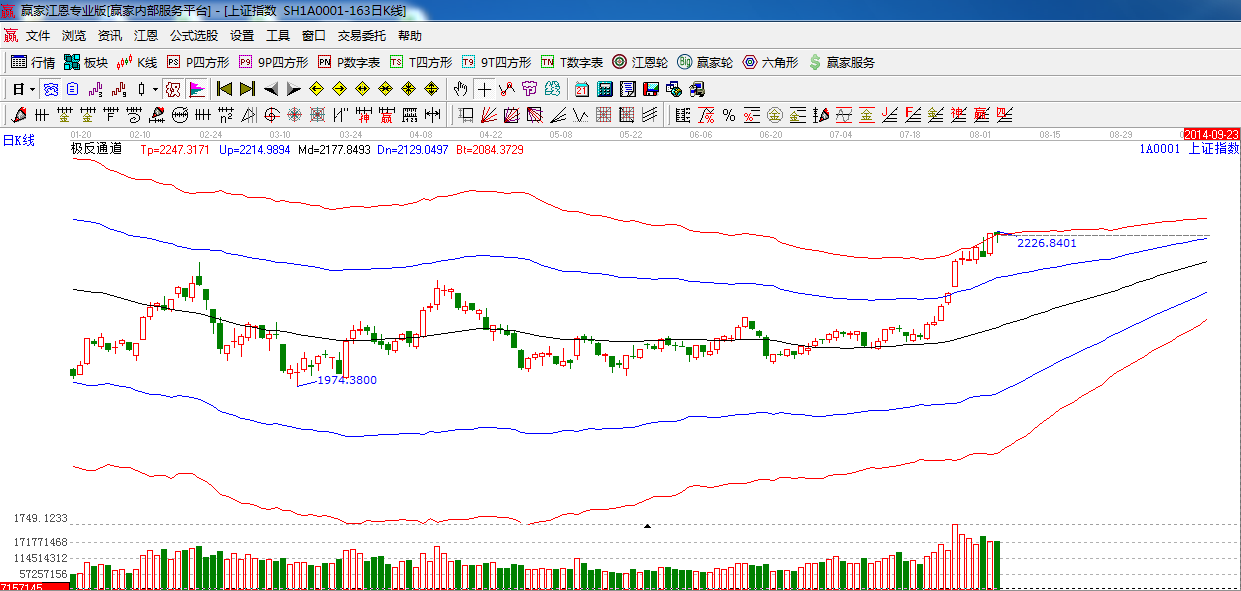 江恩看盤綜述:依據(jù)贏家江恩技術(shù)工具分析得出:目前指數(shù)一直處于極反通道外軌阻力震蕩攀升,量能同比回落,昨日藍(lán)籌股全線回調(diào),對指數(shù)上行構(gòu)成壓力,預(yù)計(jì)今日指數(shù)沖高回落,短期內(nèi)或見階段小頂,操作上,合理控制倉位,做好高拋低吸。
